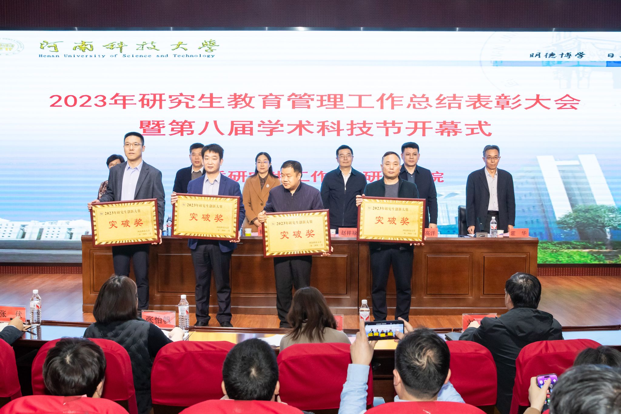 杨霞作总结讲话。她对我校2023年研究生教育管理工作和研究生创新创业方面取得的成绩表示肯定与鼓励,并对各单位研究生工作提出建议:各单位要进一步总结经验,围绕思政教育工作品牌化、支部党建工作特色化、创新实践工作项目化、研究生安全稳定工作全覆盖等方面,为构建“河南科技大学新时代研究生教育新体系”而继续奋斗。她对广大研究生提出三点希望。一是坚定理想信念,践行初心使命,努力成长为堪当民族复兴重任的时代新人;二是厚积薄发、砥砺前行,在报效祖国、服务人民的人生中有所作为;三是求真问学,勇于创新,以研究学问为宗旨,把学习与科研、理论与实践结合起来,敢于率先挺进科研“无人区”,抢占创新“制高点”。她期望广大研究生以第八届学术科技节为契机,坚定创新创造自信,开阔眼界、提升格局,勇攀科技高峰,不断提升科技创新能力。