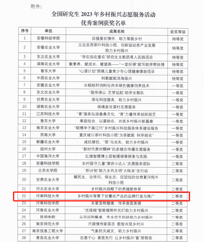 我校研究生获评全国研究生2023年乡村振兴志愿服务活动优秀案例。在“全国研究生2023年乡村振兴志愿服务活动优秀案例”的评选中,河南科技大学的研究生团队“乡村振兴背景下甘薯农产品的品牌打造与推广”项目荣获二等奖!