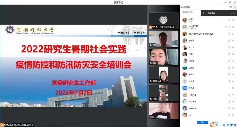 7月7日下午,由党委研究生工作部主办的2022年研究生暑期社会实践安全培训会通过腾讯会议线上举行。河南科技大学第一附属医院急诊重症专科护士胡辉,河南科技大学研究生管理科科长王泽远及暑期社会实践团队成员参加会议,会议由机电工程学院2021级研究生王杲主持。