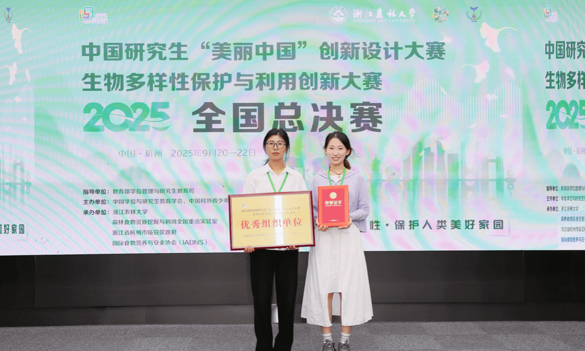 2025年9月20日至22日,2025年中国研究生“美丽中国”创新设计大赛——生物多样性保护与利用创新大赛全国总决赛在浙江农林大学举行。我校学子在比赛中表现优异,共获得二等奖1项、三等奖3项。