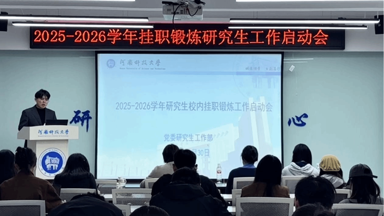随后,综合中心主任邵瑞璇宣读了《河南科技大学2025-2026学年校内挂职锻炼研究生名单》。原综合中心李雪松同学进行挂职工作总结,分享过去一年的经历和收获;新一届挂职研究生代表王菲同学表达了对未来挂职锻炼的期待和决心。最后,研究生管理科副科长张扬老师在总结讲话中,对过去一年的挂职锻炼工作给予了高度评价,并对未来的工作提出了期望和要求。