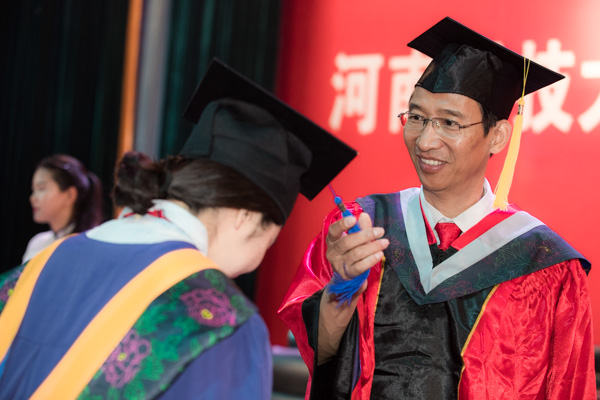 孔留安校长讲话。他代表全校近五万名师生员工向获得硕士学位的全体毕业生表示热烈的祝贺,向辛勤培育研究生成长成才的老师和家长们表示诚挚的谢意,并以“书写好你们创新创业的精彩人生”为题给大家上了离校前的最后一课。孔校长指出,同学们在河科大学习的几年,亲历和见证了学校建设“国内先进、具有自身特色的高水平综合性大学”的跨越式发展,充分践行了“明德博学、日新笃行”的校训,发扬了“自强不息、追求卓越”的河科大精神,收获了知识、体味了快乐、提升了能力和素质、锤炼了意志和品行,以自己的才华和行动书写了研究生时代的精彩华章。