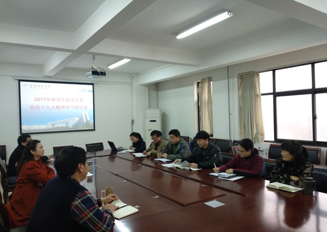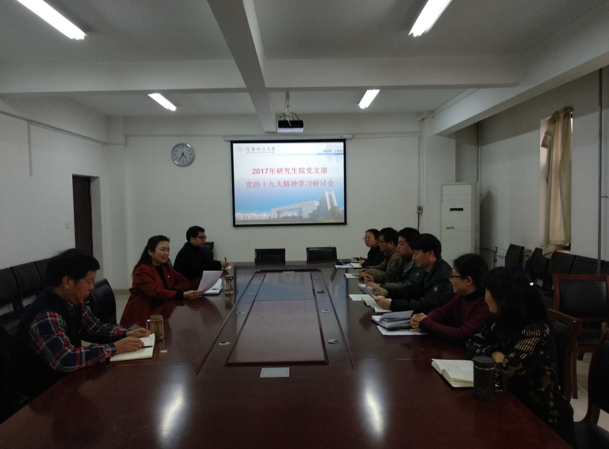 2017年12月27日,研究生院党支部在致远楼409会议室组织全体支部党员开展党的十九大精神学习研讨会,会议由党支部书记张静同志主持。党委研究生工作部部长王晓梅、支部组织委员陈建峰分别领学并作主题发言。