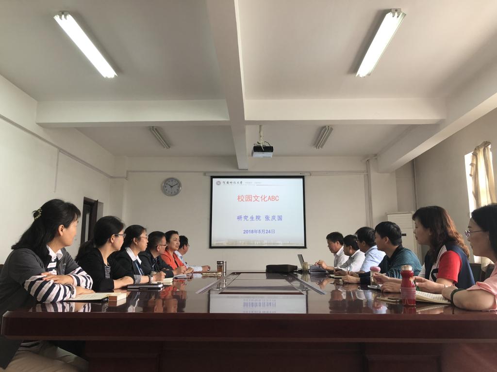 为深入贯彻落实党的十九大精神,提高研究生院全体人员的理论水平、管理素质、综合能力,为进一步加强作风建设,党委研究生工作部/研究生院于2018年4月启动了综合能力提升与作风建设系列培训。5月24日下午,由研究生院副院长张庆国教授主讲的“校园文化ABC”专题讲座在致远楼409会议室举行。讲座由研工部部长王晓梅教授主持,研工部、研究生院全体人员参加。