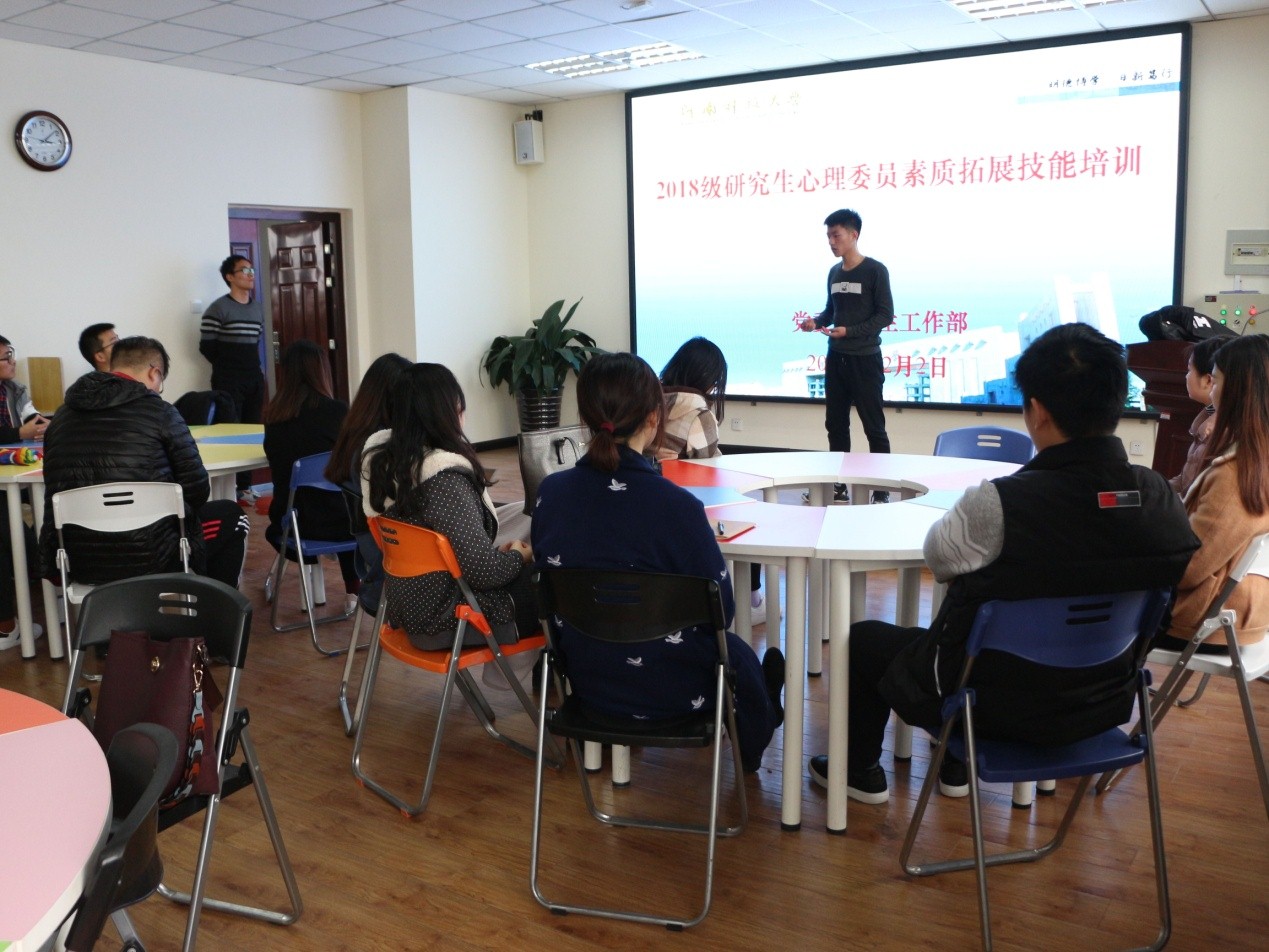 12月2日下午,由党委研究生工作部、校心理健康中心联合举办的“体验成长提升自我”研究生心理委员素质拓展技能培训在我校心理健康中心举行。培训由党委研究生工作部副部长张静老师主持,研究生心理委员联合会成员、全校2018级研究生心理委员参加。