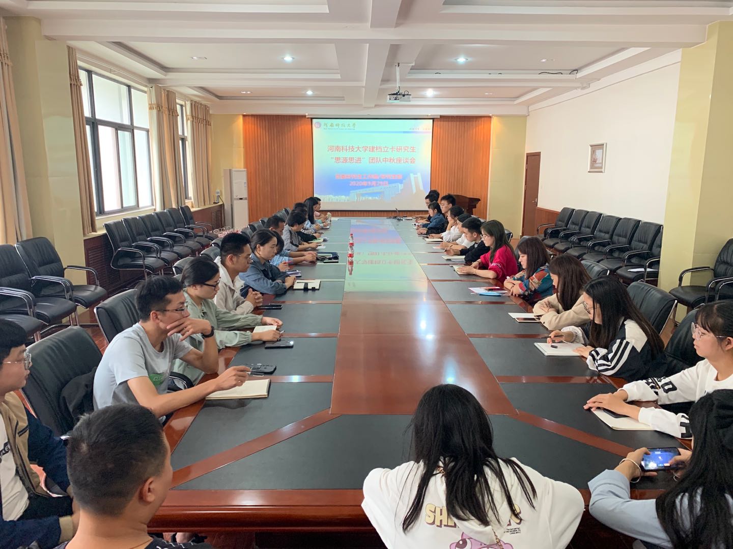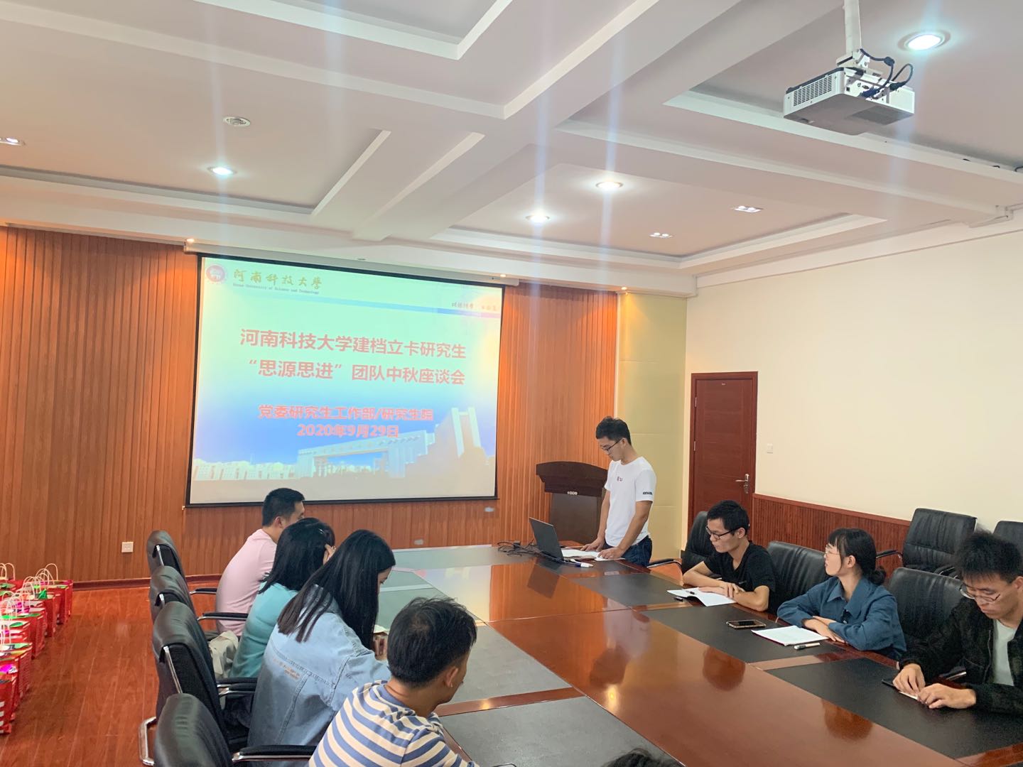 9月29日下午,我校研究生“思源思进”团队中秋座谈会在工科2号楼308会议室举行。党委研究生工作部部长刘素芹、副部长张静、研究生教育管理科科长王泽远与“思源思进”团队研究生欢聚一堂,展开交流。