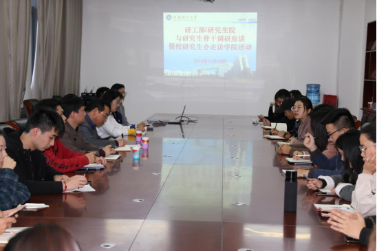2019年11月15日下午,研工部/研究生院开展的研究生调研座谈暨校研究生会走访学院活动(第四期)在开元校区农科二号楼336会议室举行。研究生院副院长康业斌教授、研究生教育管理科科长陈建峰老师、学位办公室梁浩老师、校研究生会主席团成员、动物科技学院、林学院研究生会负责人和动物科技学院、法医学院、护理学院、林学院、农学院、医工学院、医学院、艺术与设计学院、物理工程学院研究生骨干参加会议。会议由校研究生会主席团成员齐锦佩同学主持。