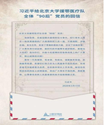 我们深知习近平总书记的这封回信不仅仅是给北大学生的,更是给所有的中国青年的,是对这群有抱负、有理想、敢担当的青年们的充分肯定,饱含着对新一代青年的殷切希望。回信中的殷殷嘱托萦绕耳畔,作为一名“90后”党员,自疫情发生以来,我一直被“90后”的战士们感动着——在这场战“疫”中,“90后”党员们以舍生忘死的行动,践行着入党的初心与誓言。一代人有一代人的历史际遇,如今“90后”党员正以实际行动证明,我们同样有着家国情怀与责任担当,不管是疫情防控,还是实现中华民族伟大复兴,青年一代一定是闯关夺隘、攻城拔寨的先锋力量,也必将扛起重任。