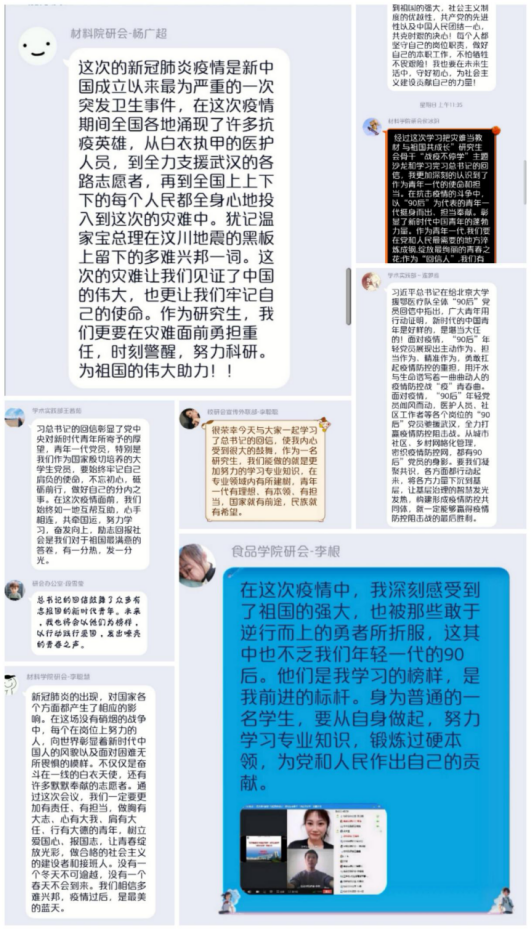 校研究生会主席团成员徐金波带领大家学习了《习近平总书记给北京大学援鄂医疗队全体“90后”党员的回信》,并畅谈了自己的学习体会。他说,青年有所为,奋进正当时。在支援湖北武汉4.2万多名医护人员中,有1.2万多名是“90后”,占整个医疗队伍的三分之一。2003年非典爆发时他们还懵懂无知,2008年汶川地震时他们正值青春年少,2020年新冠肺炎疫情防控阻击战打响时,他们化身抗“疫”战士,走上一线,保卫人民健康。一个时代有一个时代的主题,一代青年有一代青年的使命,现在正赶上中国高速发展腾飞的美好新时代,作为青年要肩负起新时代赋予的重任,在实践中勇于创新创造,为祖国的发展贡献自己的青春力量。我们定不负总书记的厚望,不惧风雨、勇挑重担,让青春在党和人民最需要的地方绽放绚丽之花。