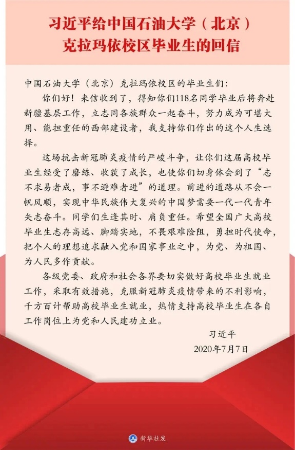 习近平总书记在信中对青年学子扎根基层、建设西部的选择表达了充分的肯定与赞扬,字里行间都流露出总书记对2020届毕业生的关怀与希冀。不可否认的是,这场突如其来的疫情给今年的毕业生们带来了较大的困扰甚至不安,但总书记的回信无疑是一针强心剂、一粒定心丸。特殊时期,当代青年更应坚定中华民族伟大复兴的崇高理想,将个人价值的实现融入国家社会建设发展当中。请坚信,没有永恒的黑夜,只有未到的黎明,疫情的影响和波动终会在党和国家的统一调配下得以消解,所有的努力都不会被辜负。祝愿同学们都能在奋斗中得偿所愿,在困境中逆风翱翔!