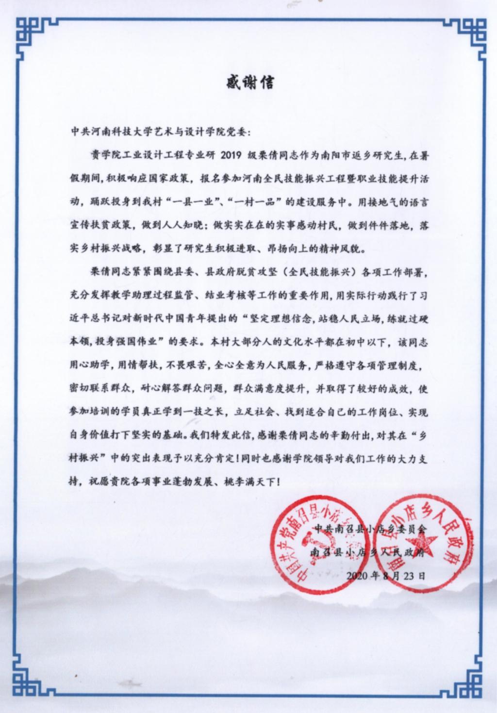 艺术与设计学院工业设计工程专业研2019级栗倩同志作为南阳市返乡研究生,在暑假期间,积极响应国家政策,报名参加河南全民技能振兴工程暨职业技能提升活动,紧紧围绕县委、县政府脱贫攻坚(全民技能振兴)各项工作部署,踊跃投身到南召县“一县一业”、“一村一品”的建设服务中,充分发挥教学助理过程监管、结业考核等工作的重要作用,用自身的实际行动落实乡村振兴战略。南召县小店乡党委、政府特向艺术与设计学院党委发来感谢信以示感谢、嘉奖。