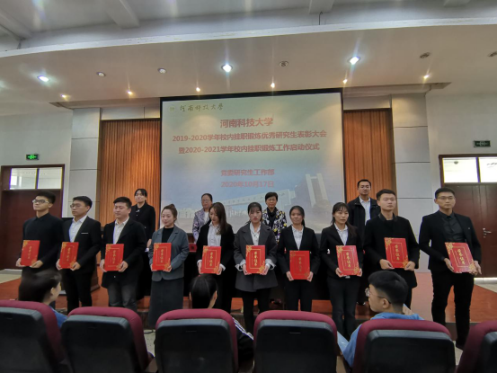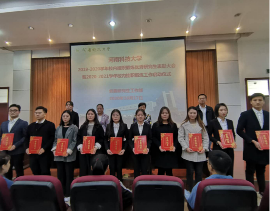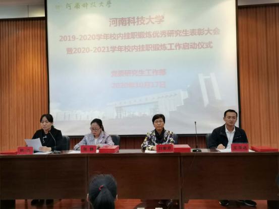会议在庄严的国歌声中拉开序幕。张静老师作2019-2020年度研究生校内挂职锻炼工作总结并宣读《关于对河南科技大学2019-2020年度校内挂职锻炼优秀研究生进行表彰的决定》;王泽远老师宣读《河南科技大学2020-2021年度校内挂职锻炼研究生名单》。与会领导为校内挂职锻炼优秀研究生颁发荣誉证书。