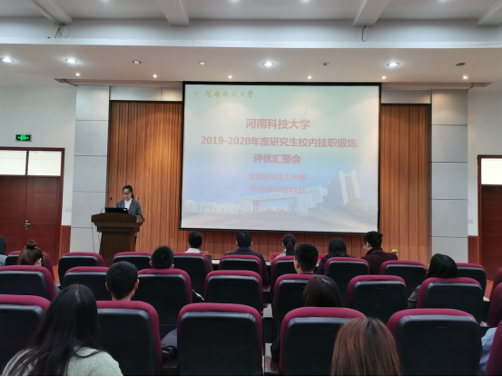为加强我校研究生实践育人工作,充分发挥管理工作在育人中的作用,2020年10月17日上午,党委研究生工作部在开元校区工科2号楼610报告厅举办2019-2020学年校内挂职锻炼工作交流暨评优汇报会。研究生工作部相关负责老师及全部挂职锻炼研究生参加汇报会,会议由马克思主义学院2020级研究生钱珩心主持。