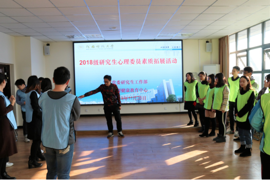 11月25日上午,由党委研究生工作部、校心理健康教育中心联合举办的“拉近你我 敞开心扉”研究生心理委员素质拓展活动在我校心理健康中心举行。活动由党委研究生工作部副部长张静主持,研究生心理委员联合会成员、全校2018级研究生心理委员参加。