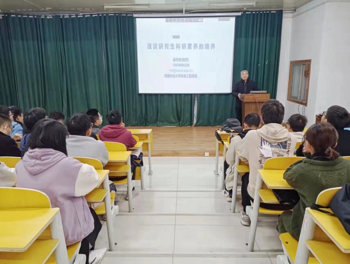 11月11日下午,由河南科技大学党委研究生工作部/研究生院主办、机电工程学院承办的“学者的学术人生”崔凤奎教授专题报告会在西苑校区南十报告厅举行。机电工程学院崔凤奎教授作“浅谈研究生科研素养的培养”的专题报告。报告会由机电工程学院研究生辅导员杨丽秀主持, 2021级研究生线下参加,其他年级研究生通过钉钉直播线上观看。
