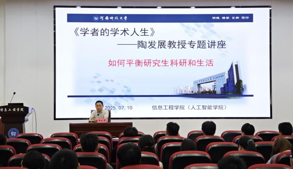7月10日下午,由河南科技大学党委研究生工作部主办、信息工程学院(人工智能学院)承办的“学者的学术人生”专题报告在开元校区工科2号楼610会议室举行。本次报告邀请信息工程学院副院长陶发展教授为我校研究生作“如何平衡研究生科研和生活”专题报告,活动由研究生辅导员袁国强主持。