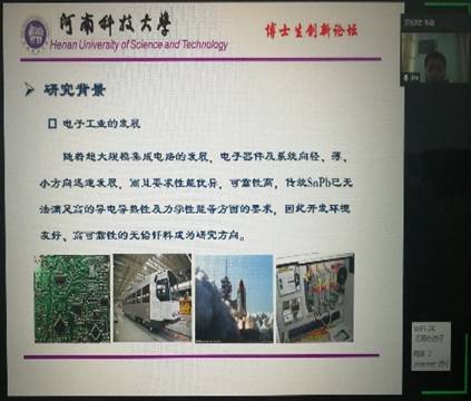 本次博士生创新论坛采取线上+线下模式,以立足材料之本、激发创新热情为主题,2017级博士研究生刘亚、张超、牛一旭、杜宜博和于华结合各自的研究课题,通过PPT形式分别作了题为《微量Y对铸态Mg-Zn-Zr-Gd生物镁合金腐蚀及力学性能的影响》《电子封装无铅焊点电、热迁移研究》《速度和载荷对凹坑表面织构乏油摩擦学性能的影响》《Cu-Fe-P合金析出相马氏体转变亚结构研究》和《节能减排型药芯复合银基钎料工艺研究》的报告。老师们就各位同学的研究内容、创新方法及存在的问题作出了相应的点评和修改建议。