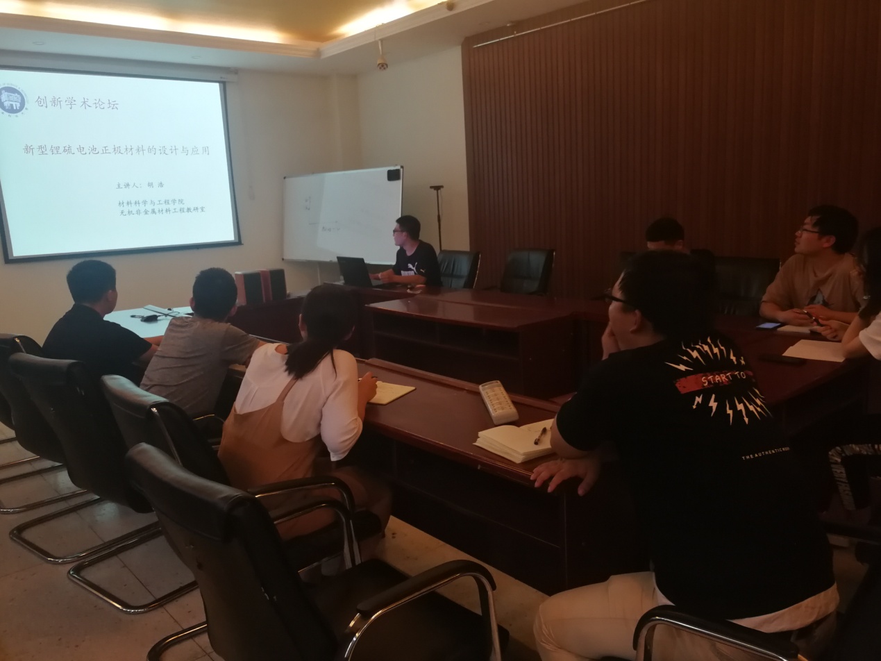 本次论坛特邀材料学院青年专家胡浩老师作了题为《新型锂硫电池正极材料的设计与应用》的学术报告,并和同学们进行深入交流和探讨,分享了课题下一步的计划与设想。