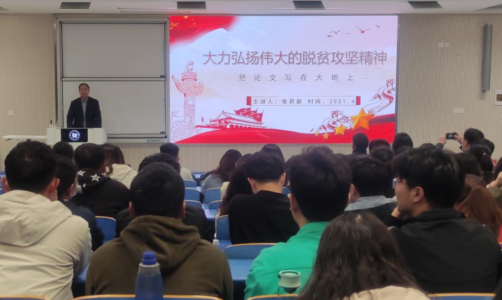 会议伊始,张君新书记围绕脱贫攻坚战取得的成果及重大意义、其蕴含的精神和巩固脱贫攻坚成果、开启乡村振兴新征程三个方面,为大家系统讲解了脱贫攻坚中党的正确引领、习总书记的关切、中央的决策部署、政策的精准务实等内容。之后,张书记特别强调了习总书记关于“脱贫摘帽不是终点,而是新生活、新奋斗的起点”的要求,希望同学们聚焦农业、农村、农民和国家社会需要,善于发现问题、勇于破解难题、敢于创新突破。最后,张书记与同学们进行了深入的互动交流,并提出殷切的希望,希望大家在以后的工作学习中,德育先行,真正把论文写在大地上,为国家富强、民族振兴、人民幸福做出积极贡献。会场气氛热烈,同学们在这场讲座中受益匪浅,政治思想觉悟得到提升,科研动力与责任担当得到进一步提高。