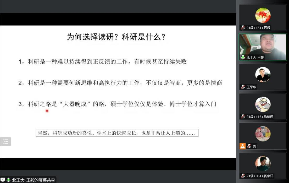 会议开始,王毅教授以自己考研失利、调剂的个人经历为切入点,分享了自己的成长过程和学习经历,他强调:科研是一种难以持续得到正反馈的工作,有时候甚至会失败,要做好充分的准备和良好的心态。接着,王毅讲述了如何建立良好的导学关系,良好的导学关系是研究生学术成功的关键因素,同学们需要做到以下几点:一是对于导师安排的科研任务,句句有回复、事事有回音;二是科学问题多跟导师讨论,技术问题多跟同门讨论;三是只问付出、不问回报,先做贡献、再提需求;四是从不提他人是非,只理性讨论问题。随后,王毅针对如何培养优秀的科研习惯也给出几点建议:一是充足时间的投入;二是保持一颗学习的心,多参加学术科研类讲座,向优秀的人学习;三是每周查阅与自己方向有关的论文,并进行精读;四是从不骄傲,因为人外有人,天外有天。最后,同学们向王毅教授踊跃地提出自己在科研学习上的问题,王毅以他独特的见解和渊博的学识使同学们耳目一新,他告诫同学们要想获得相应的学术成绩必须付出相对应的时间,踏踏实实地做学术研究。