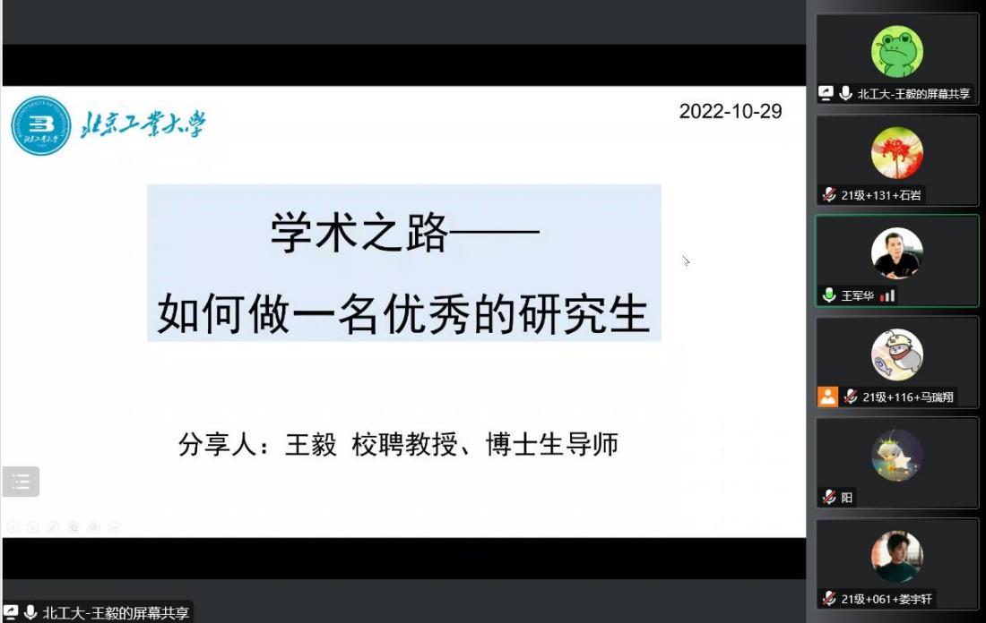 10月29日下午,由河南科技大学党委研究生工作部/研究生院主办、机电工程学院承办的第107期“博学大讲堂”于线上进行。此次会议由机电工程学院机械电子工程系副主任王军华老师主持,机电工程学院全体研究生线上参加。研究生学习阶段是一个人学术成长道路上非常关键的时期。读研期间,应该如何做一名优秀的研究生?围绕这一问题,机电工程学院邀请北京工业大学材料与制造学部校聘教授、博士生导师王毅做客研究生“博学大讲堂”。王毅教授以“学术之路——如何做一名优秀的研究生”为主题展开报告会。