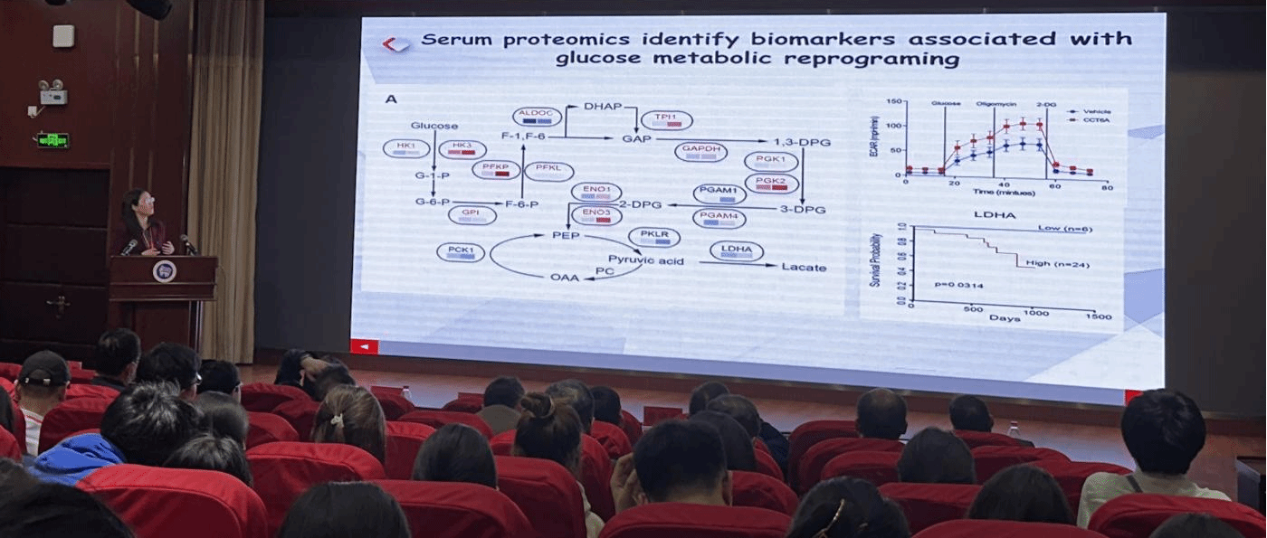 讲座上,李三强院长首先介绍了王兰副教授的科研经历以及取得的一些优秀成果,让同学们对王兰副教授有了深刻的了解和认识。接着,王兰副教授开始向同学们讲述她的研究成果,基于特发性肺纤维化患者的血清蛋白质组学数据,依据蛋白质组图谱将肺纤维化患者进行了分子分型,发现了衰老相关的血清生物标志物。分子图谱与临床特征相关性研究发现血清中高乳酸患者出现典型的糖代谢重编程,并通过机器学习深度解析了与其相关的生物标志物组合。这一成果在肺纤维化研究领域取得的又一重要进展,为特发性肺纤维化的诊断和治疗奠定基础。最后,讲座在热烈的掌声中结束,很多老师和同学不舍离去,争相提问。王兰副教授与在场师生进行了互动并耐心地解答了同学们所提出的问题。