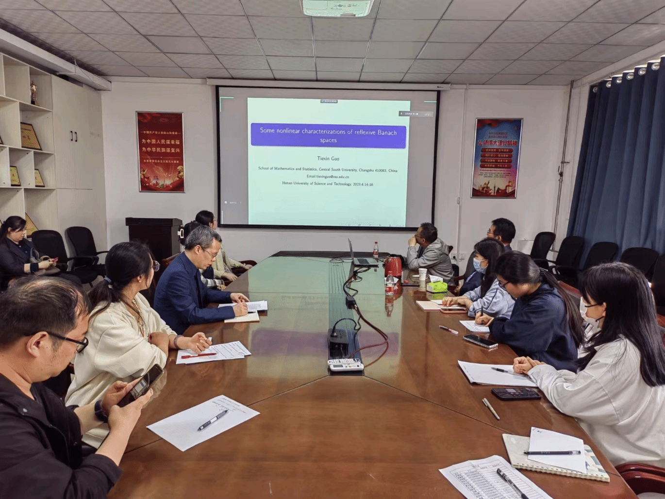 郭铁信教授。郭铁信教授报告的题目是《Some nonlinear characterizations of reflexive Banach spaces》,首先对报告背景进行介绍,通过一些构造技能或下卷积的正则化技能,表明自反Banach空间上序列弱下半连续强制函数的信息实现的基本命题的公式及其重要的变量是相互等价的,并且等价于底层空间的自反性。