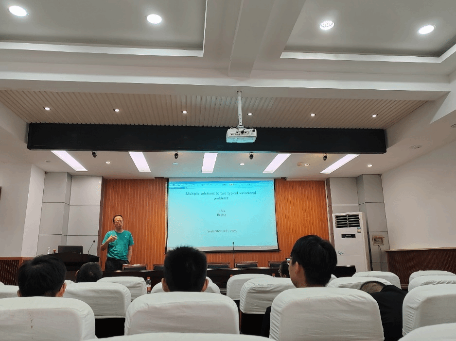 马力教授首先介绍了变分多解问题的研究背景以及历史上的研究成果,建议同学们阅读数学史并且向伟大的科学家学习。然后从Sobolev空间,Hilbert空间以及泛函引入,介绍了变分多解问题,从Kazdan-Warner问题开始,并且重点介绍了Yamabe型和取球面值的调和映射问题,可以利用最佳常数法以及与爆破解相互作用的直接法来解决。之后讲述了马力教授及其学生的学术成果和科研经验和心得,建议同学们多学习优秀的研究成果,尤其对其中忽略的部分做更加深入的研究。最后与同学们进行了进一步的探讨和交流,以自己的阅历为同学们答疑解惑,激发同学们深入学习研究的热情。