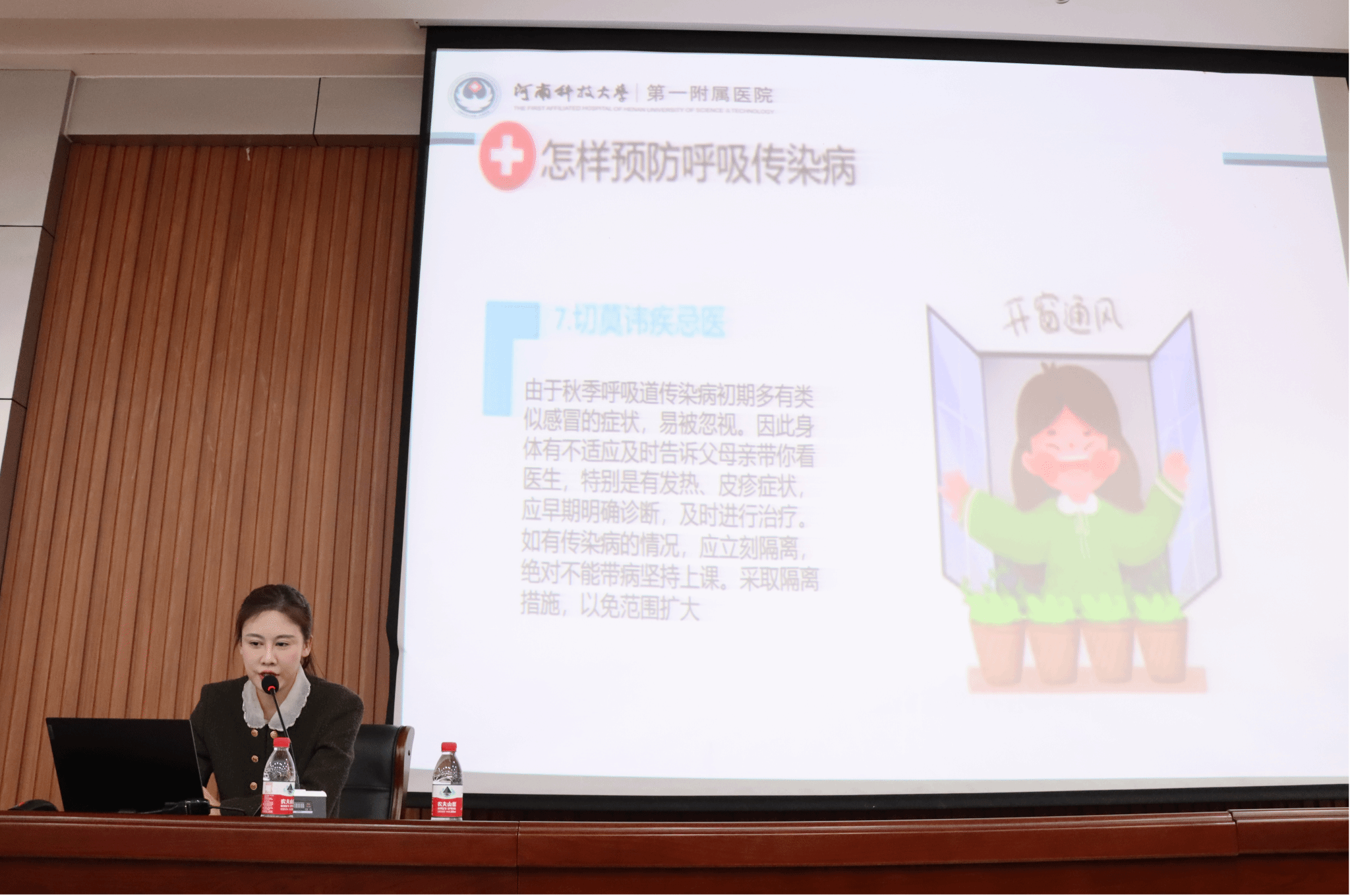 邓旻楠医师首先从肠道系统和呼吸系统两个角度介绍了秋冬季常见疾病以及传染病的症状,并针对以上秋冬季易发疾病给同学们介绍日常生活中的预防措施。之后,邓医师从三个不同的方面介绍了心脑血管疾病的危害,阐述了导致引发心脑血管疾病的各种因素,并提醒同学们控制饮食,坚持日常锻炼,戒烟戒酒,保持良好的生活习惯才能更好地开展今后的学习和科研生活,避免心脑血管疾病的发生。