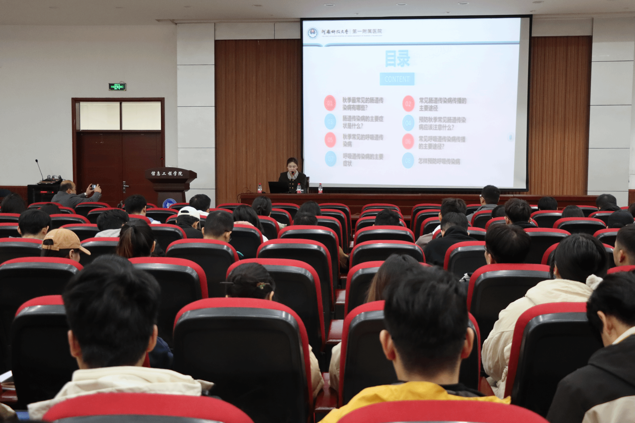 11月10日下午,由河南科技大学党委研究生工作部主办、信息工程学院承办的第136期“博学大讲堂”在河南科技大学开元校区工科2号楼610会议室举行。本次活动邀请到河南科技大学第一附属医院神经内科主治医师邓旻楠作主题为“冬季疾病与心脑血管疾病预防”的讲座。此次活动由信息工程学院研究生辅导员曹昂老师主持,尹亚茹老师及信息工程学院两百多名研究生参加。