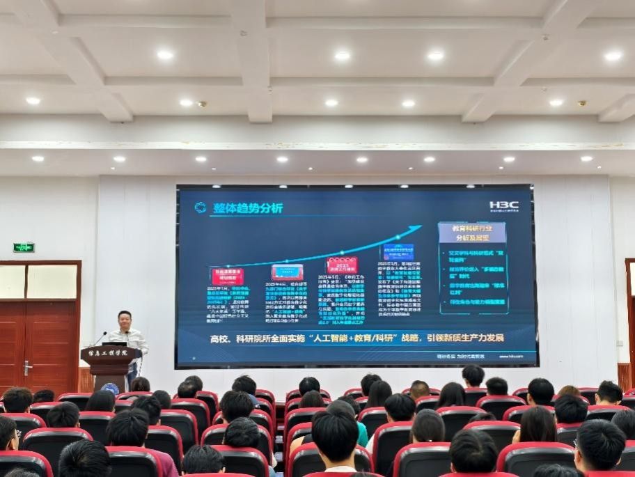 汪卫国阐述了公司在信息通信、云计算、大数据及人工智能等前沿技术领域的核心优势与战略布局,分享了人工智能在智慧校园建设中的多项应用实践与发展前景。他鼓励广大学生积极把握数字时代机遇,主动投身人工智能相关的学习与研究实践。他表示,新华三将继续深化与高校的合作,共同推进教育科研体系的数字化转型与智能化升级,助力构建高质量教育支撑体系。