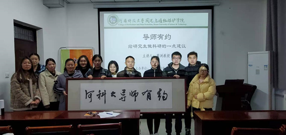 12月4日下午,由河南科技大学党委研究生工作部主办,园艺与植物保护学院承办的第74期“导师有约”在开元校区农科三号楼331会议室举行。本次活动由硕士生导师周洲教授主讲, 20级全体研究生参加。