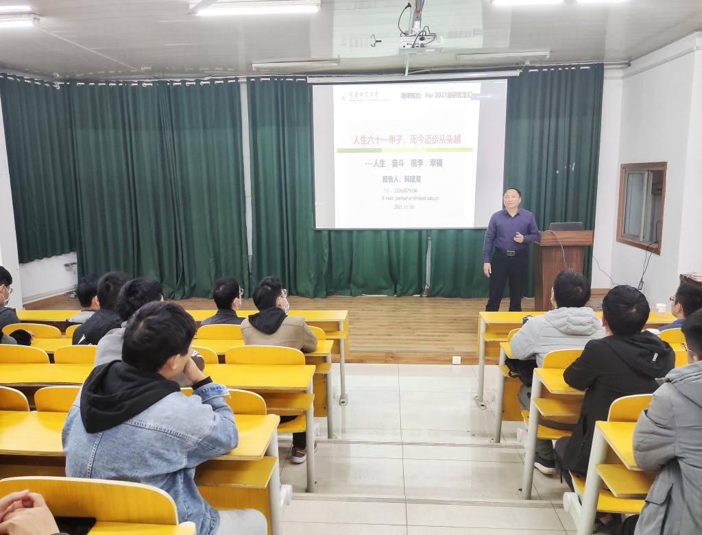 11月18日下午,由河南科技大学党委研究生工作部/研究生院主办、机电工程学院承办的第93期“导师有约”在西苑校区南十报告厅举行。博士生导师韩建海教授与广大研究生就“人生六十一甲子,而今迈步从头越——人生,奋斗,桃李,幸福”进行了深入探讨与交流。本次讲座由机电工程学院研究生秘书李东林主持。