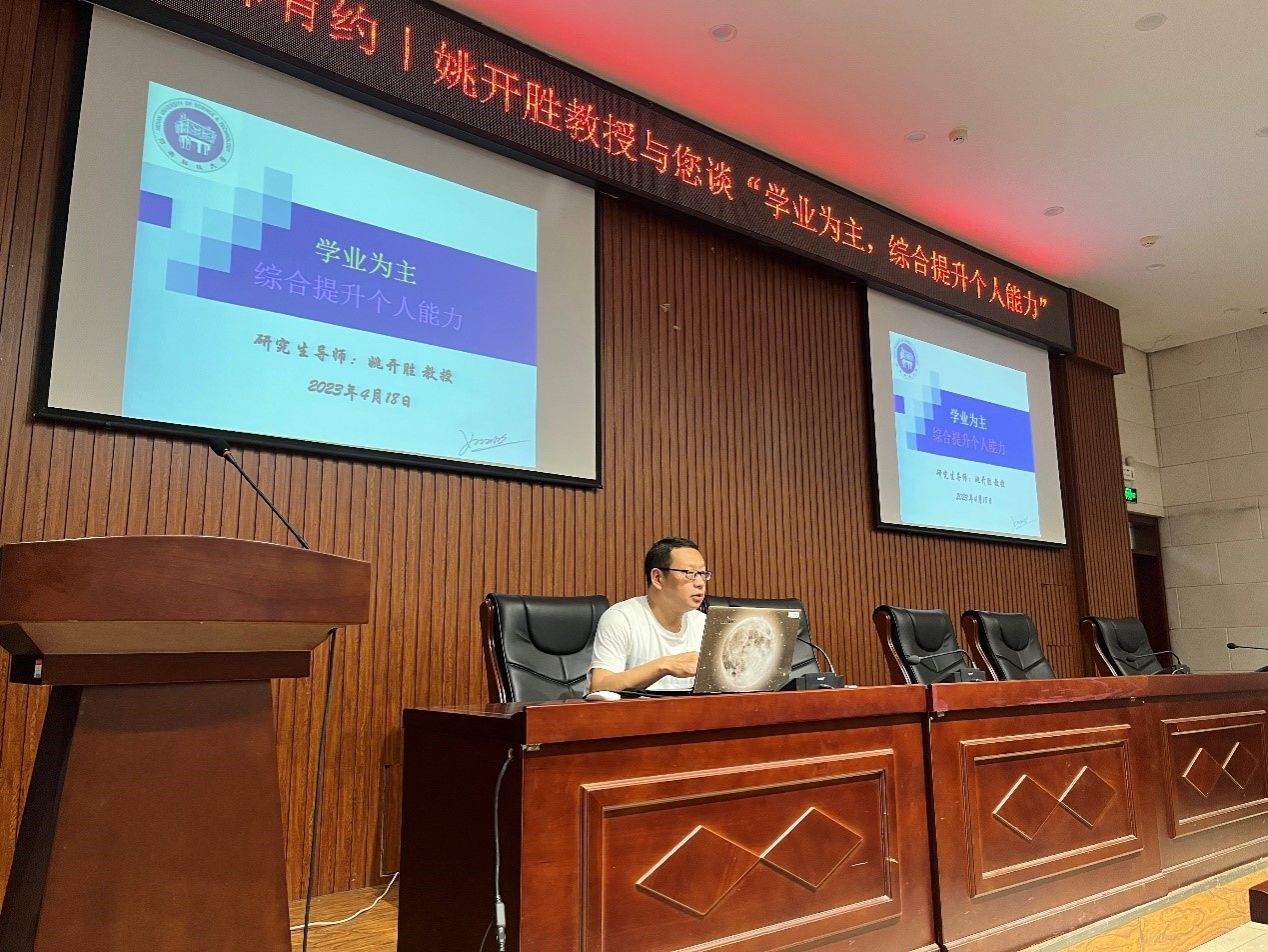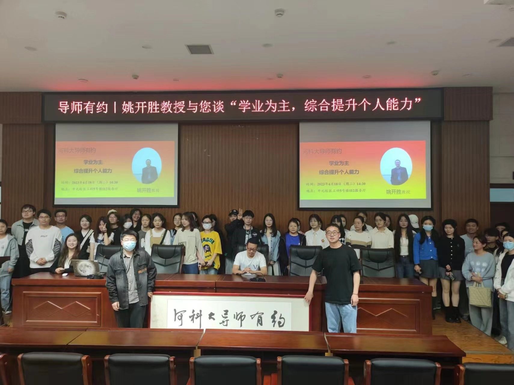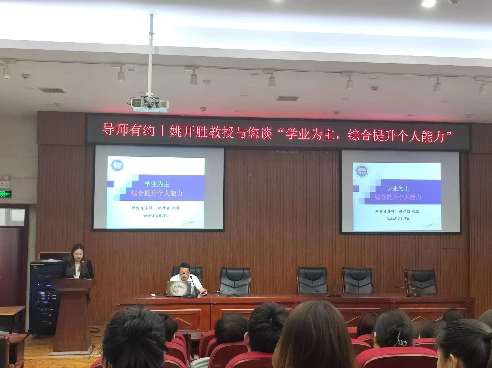 2023年4月18日下午,由党委研究生工作部/研究生院主办、化学化工学院承办的第123期“导师有约”在河南科技大学开元校区工科5号楼112报告厅顺利举行。化学化工学院研究生导师姚开胜教授围绕“学业为主,综合提升个人能力”与研究生面对面进行了深入探讨与交流。此次活动由研究生辅导员赵雨桐主持,化学化工学院2022级全体研究生参加本次活动。