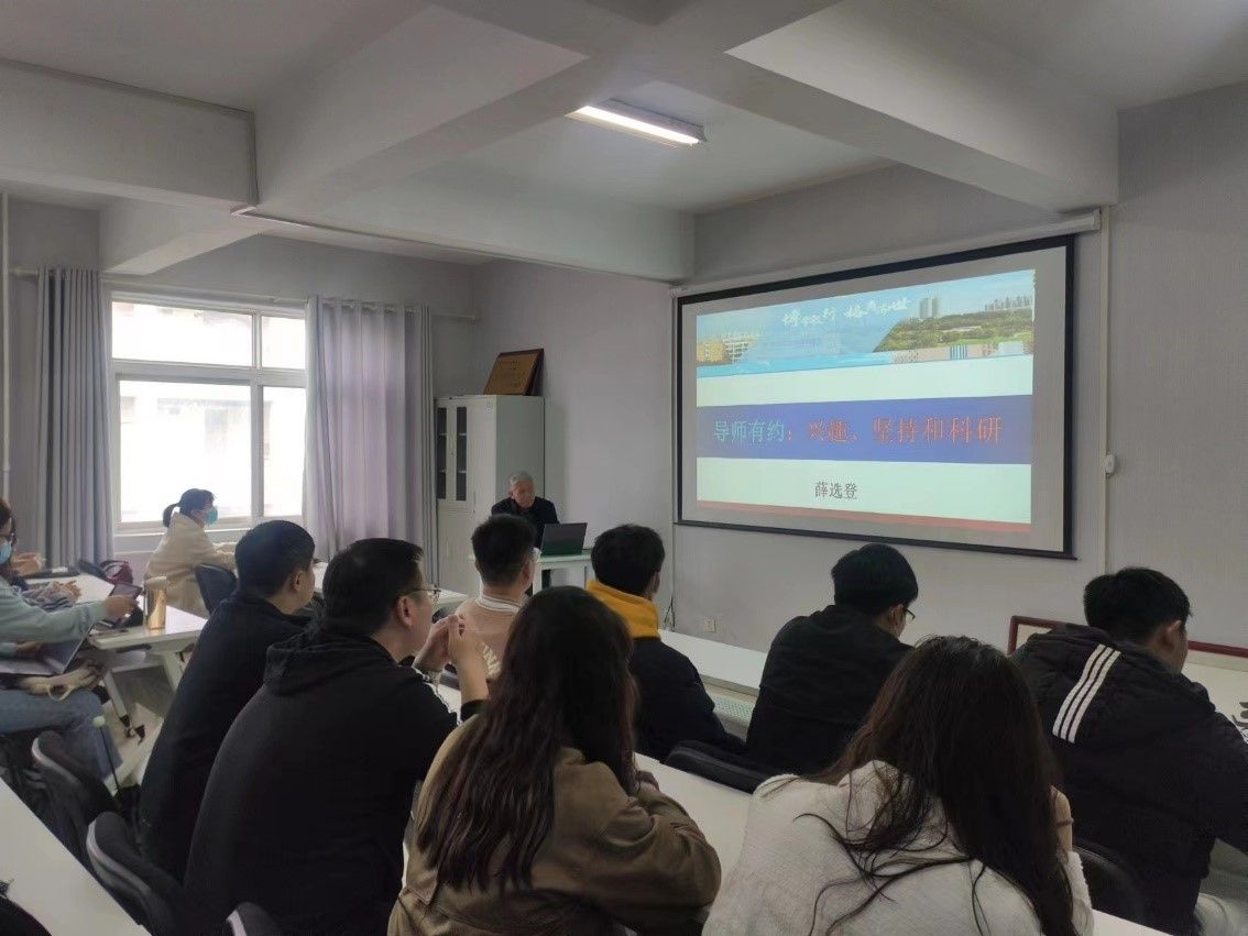 4月22日下午,商学院于嘉园10号楼(河洛书院)五楼青年之家会议室顺利举办“导师有约”讲座,硕士生导师、经济系系主任薛选登教授做客,与研究生畅谈兴趣、坚持和科研。本次讲座由研究生辅导员杨柳松老师主持,商学院21级、22级研究生参加学习。