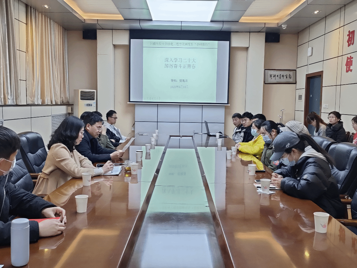 3月15日下午,为提升机电工程学院研究生的思想政治水平,由河南科技大学党委研究生工作部/研究生院主办、机电工程学院承办的“导师有约”在西苑校区3号楼105教室举行。本次活动邀请机电工程学院硕士研究生导师贾现召教授作题为“深入学习二十大,踔厉奋斗正青春”的讲座,活动由机电工程学院研究生辅导员杨丽秀主持,参与对象为机电工程学院部分研究生。
