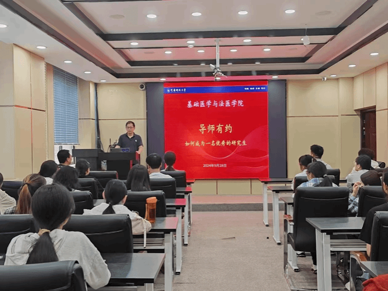 2024年9月28日下午,由党委研究生工作部/研究生院主办,基础医学与法医学院承办的“导师有约”在医科一204教室顺利举行。基础医学与法医学院硕士生导师刘熔增副教授与研究生面对面就“如何成为一名优秀的研究生”进行了深入探讨与交流。基础医学与法医学院副院长翟仙敦出席本次活动,研究生辅导员巫鹏飞主持本次活动,24级全体研究生参加本次活动。
