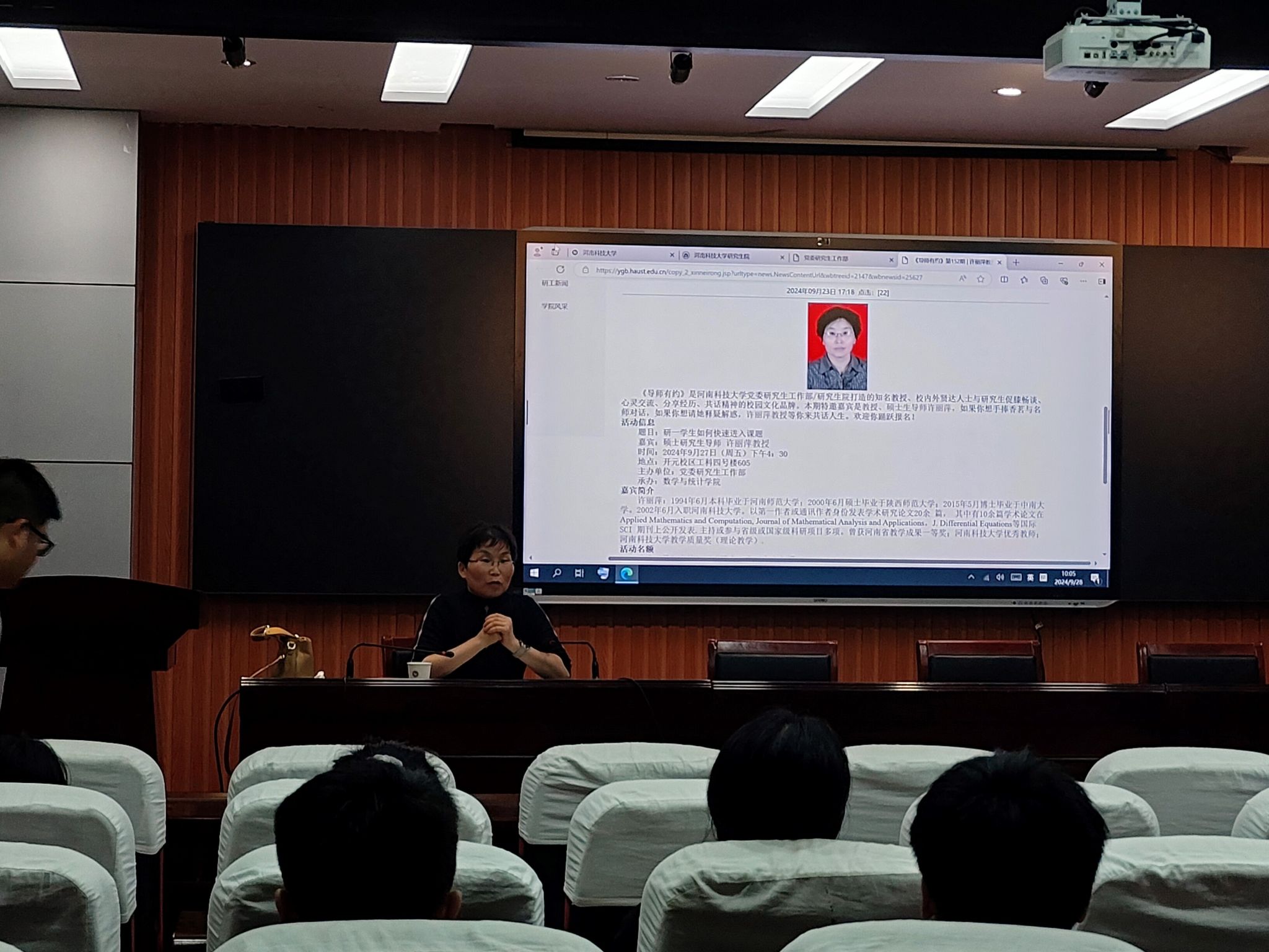 9月27日,数学与统计学院在工科4号楼605室举办了第152期“导师有约”讲座,本次讲座由数学与统计学院辅导员屈德强主持,邀请了数学与统计学院许丽萍教授主讲。讲座旨在导师向研一新生分享学习经验,为研究生如何适应新环境,完成学业目标提供建议。