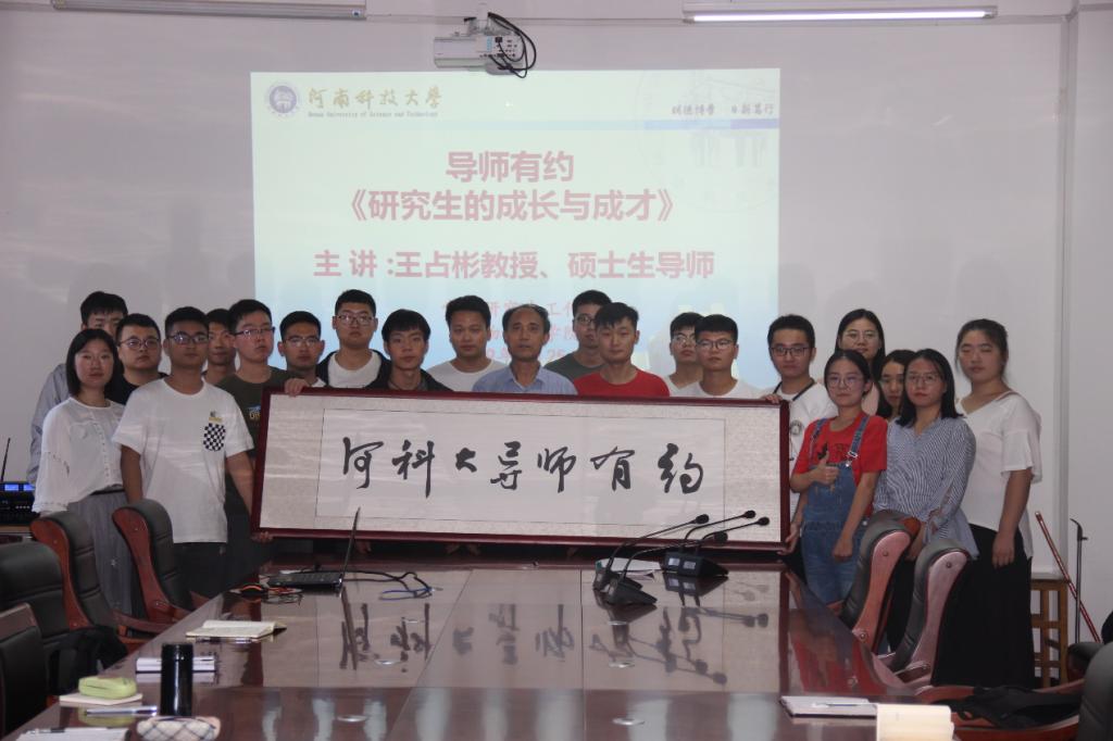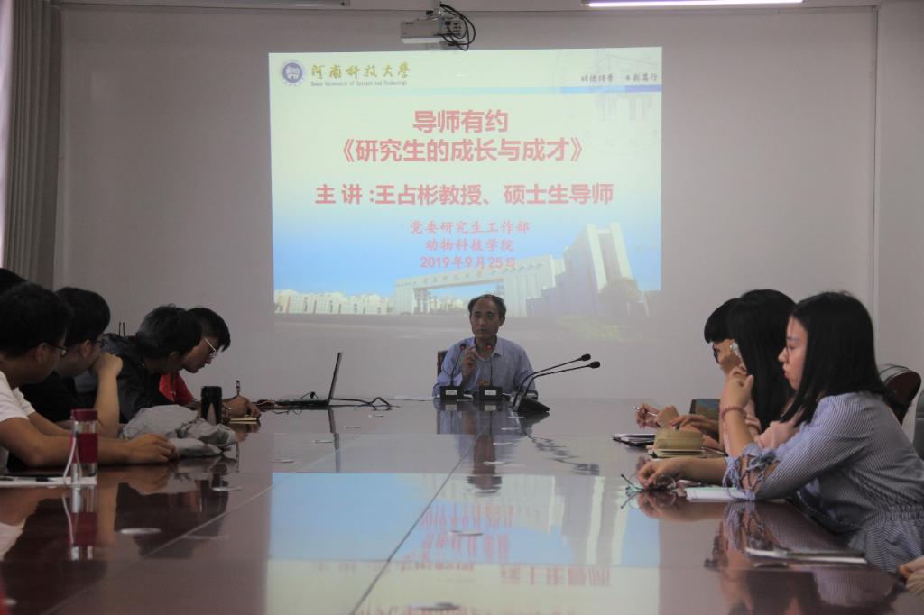9月25号下午,由河南科技大学党委研究生工作部/研究生院主办,动物科技学院承办的第50期“导师有约”在开元校区动科楼336会议室举行。动物科技学院王占彬教授与2019级动科学院研究生以及通过“河南科技大学研究生”微信公众平台报名、遴选出的研究生面对面畅谈“研究生的成长与成才”。