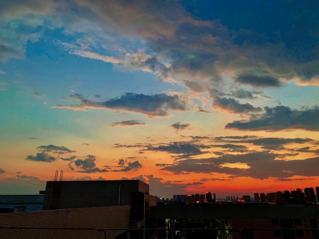 下午三四点钟,秋雨过后,东方挂起了一道绚丽的彩虹,同学们开始呼朋唤友欣赏着美景。随着彩虹的逐渐消逝,落下的太阳照亮了西边的天空,燃烧着一片橘红色的晚霞。