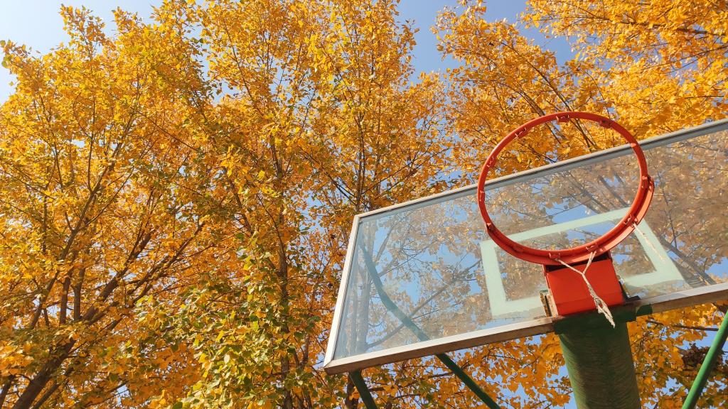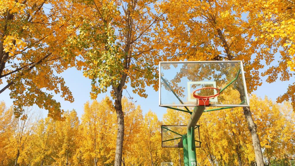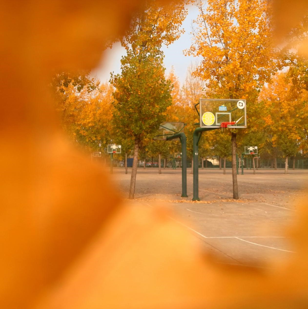 一阵秋风一地黄叶,随手捡起一张破碎的残叶,透过金黄的色彩看秋日的景象,空旷的篮球场,仿佛正诉说这一季秋天。