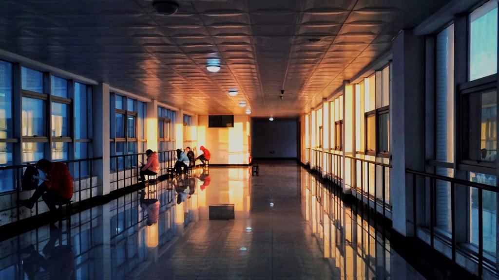 这张令我感触的照片始终放在我的手机相册中。一直记得当初看到这个场景的感受。那是一个要到工科六号楼上专业课的清晨,走到走廊时,阳光刚好洒到走廊里,正在读书的学生被光包围着。这个唯美而又有力量的场景触动到了我的内心,我站在走廊尽头拍下这张照片后悄悄离开了。