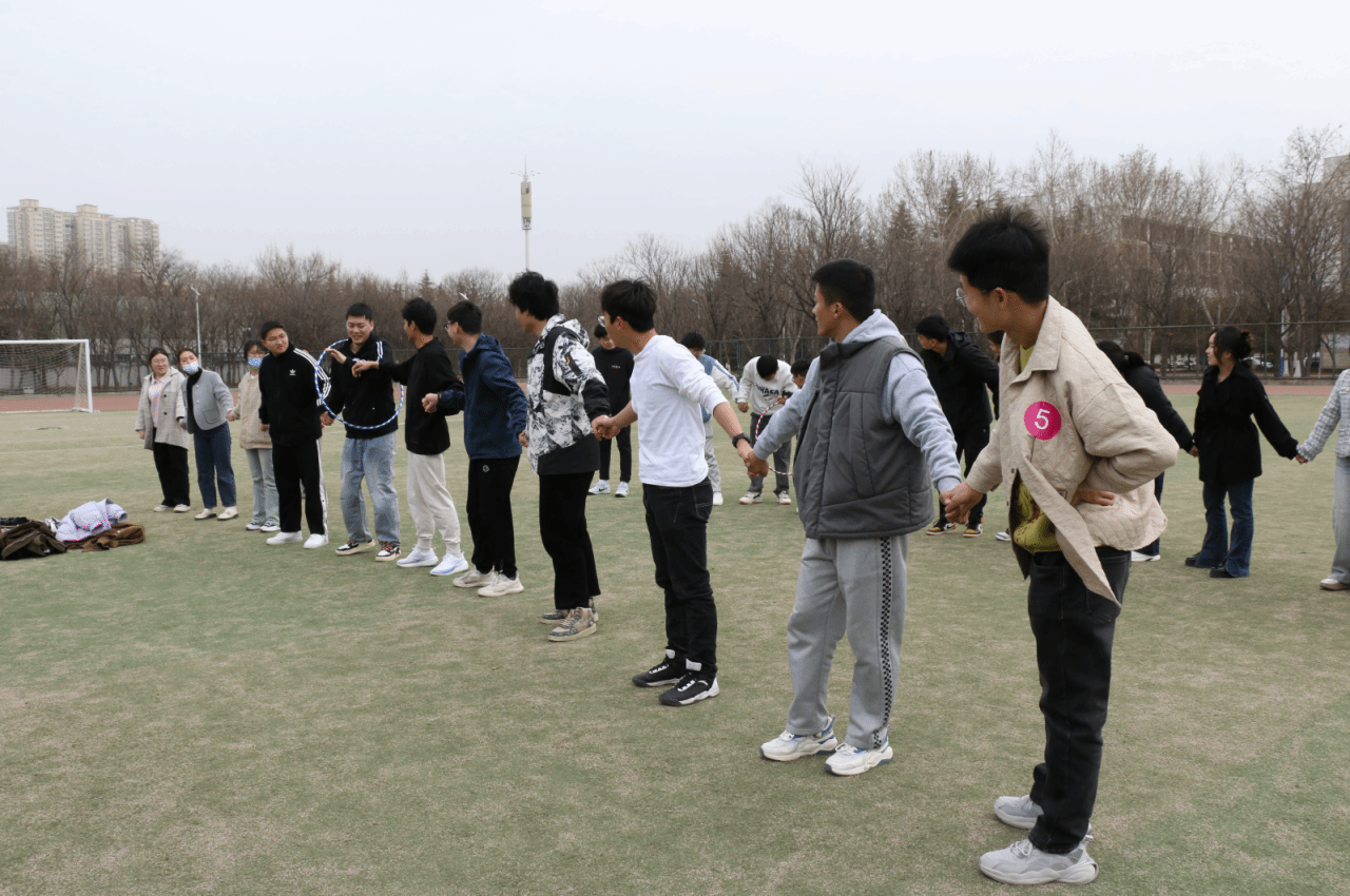 队员们手牵手围成一圈,用呼啦圈从起始人开始依次穿过所有人的身体回到原位。套圈像赋予了生命一般,在队伍中灵活自由地穿梭。低头的、弯腰的、抬腿的……整个活动现场弥漫着紧张激烈的氛围。
