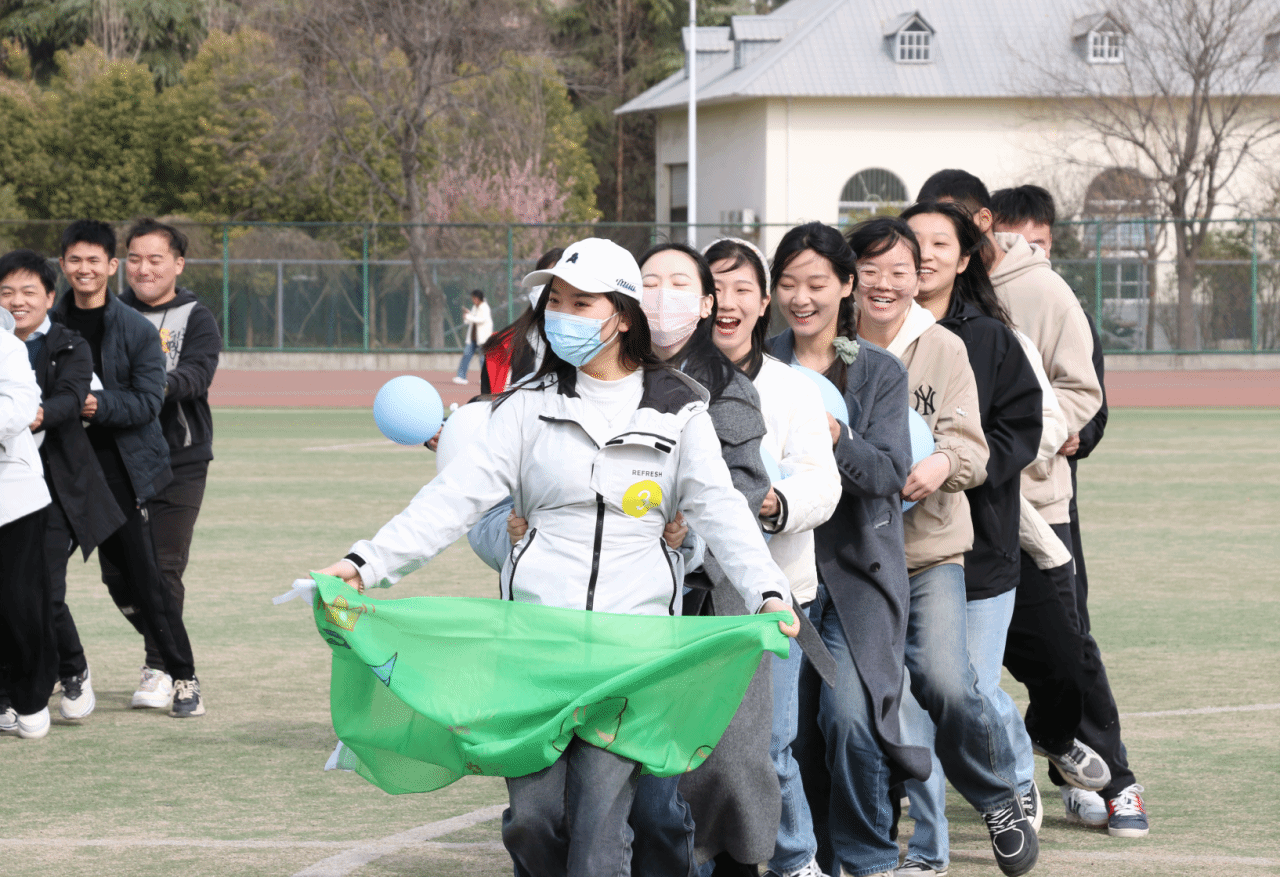 队员们两人一组,背对背用身体夹爆气球,手拉手、背靠背,相互配合,一浪高过一浪的喝彩声点燃了大家的斗志。