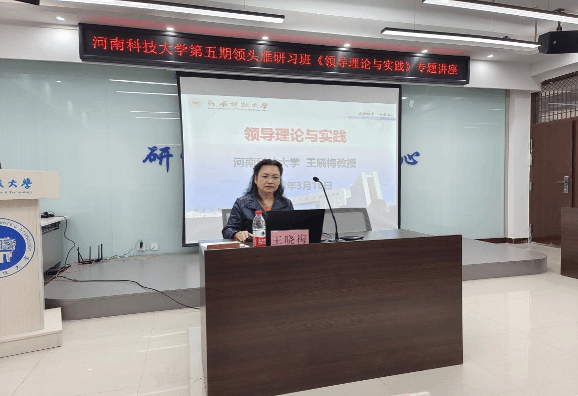 2023年3月18日上午,河南科技大学商学院王晓梅教授在开元校区研究生跨学科交流中心为第五期研究生“领头雁”研习班学员做《领导理论与实践》专题讲座。本次讲座由机电工程学院2021级研究生王杲主持。