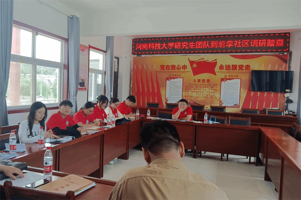 前李社区主任张迎波主持了“河南科技大学研究生团队到前李社区调研踏查”会议,王书记向大家介绍了前李社区的整体概况,分别从宏观发展环境、沟域经济发展概况、城市发展规划以及市场环境四个方面详细介绍了该社区的发展状况,让调研的老师和学生对前李社区有了基本认识,通过与社区老教师、老党员、老干部、乡贤等谈话中了解前李社区的村史文化。