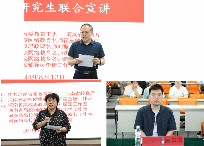 为深入学习宣传贯彻习近平新时代中国特色社会主义思想和党的二十大、二十届三中全会精神,喜迎新中国成立75周年,8月13日,由中共河南省委教育工委、河南省教育厅、河南科技大学宣传部指导,河南科技大学、河南省高校网络教育名师霍玉敏工作室承办的名师工作室交流研讨会暨五校研究生联合宣讲活动在河南科技大学举办。五个工作室分别来自郑、汴、洛三地、涵盖网络教育名师工作室、思政课名师工作室、辅导员工作室不同类别,五个宣讲人来自全国东西南北中的五所高校。会议以线上线下形式进行,一是组织并共同指导五校研究生的联合宣讲;二是五个名师工作室就未来合作的交流研讨。现场有各名师工作室成员、河南科技大学研究生宣讲团及部分学生到会。