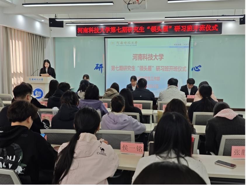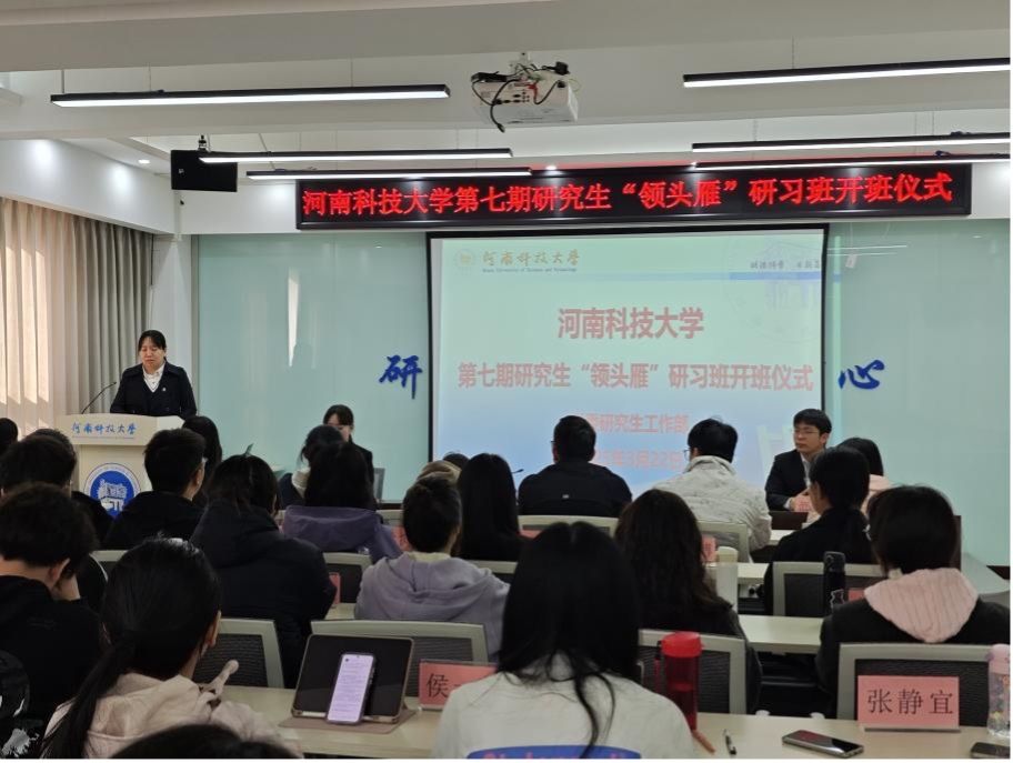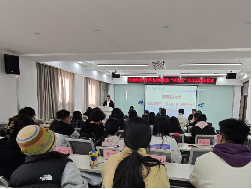 3月22日,由党委研究生工作部主办的河南科技大学第七期研究生“领头雁”研习班的开班仪式于开元校区跨学科交流中心举行。党委研究生工作部思政教育科科长陈洁、“领头雁”研习班助教林立果、“领头雁”研习班班长范庆丰和第七期研究生“领头雁”研习班学员参加仪式。