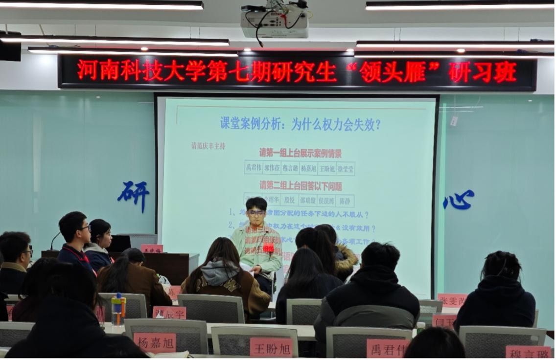 随后,王晓梅通过学员们演绎和点评的课堂案例《权力为什么会失效?》来分析学生干部的领导困境,以及应该如何应对引出“什么是领导者”、“领导者和管理者的区别与联系”、“领导力从何而来,如何正确使用领导力”以及“职权如何使用”等深刻命题。讲座中,王晓梅教授告诉大家,领导者应该是权力、责任和服务三位一体的,领导不一定是管理者,但管理者应该成为领导者,其职权应该通过“多赞扬,少批评,多引导,多请求”的方式使用,领导者要以优良的品格、杰出的才能、深厚的感情和渊博的知识树立个人威信,让学员们深刻认识到作为优秀领导者所应具备的素质和能力。最后,王晓梅教授进行了总结,希望在座的每一位能够不断深化学习,更有效地将领导理论融入实践之中,从而在研究生队伍中真正起到引领示范的“领头雁”作用,成为政治立场坚定、敢于负责、品行出众的学生领袖。