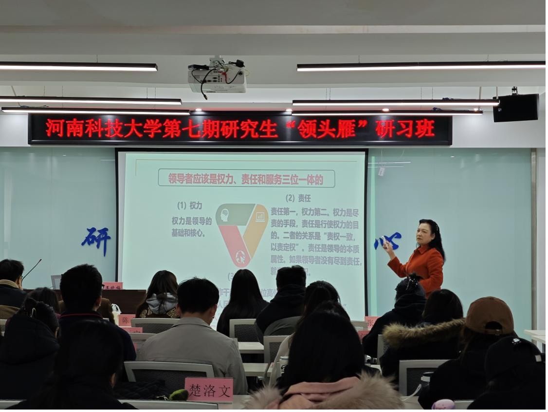 首先,王晓梅教授阐述了设定研习班的初衷,“领头雁”的含义及“大雁精神”的内涵,强调了领导干部对于整个团队的重要性。随后,王晓梅教授从河南科技大学的研究生思政教育和能力培养方面的体系和队伍建设入手,结合自身多年管理岗位领导工作经历讲述了研究生干部如何成为卓越的领导者,包括领导风格、领导特性、领导行为和领导情景五个方面。